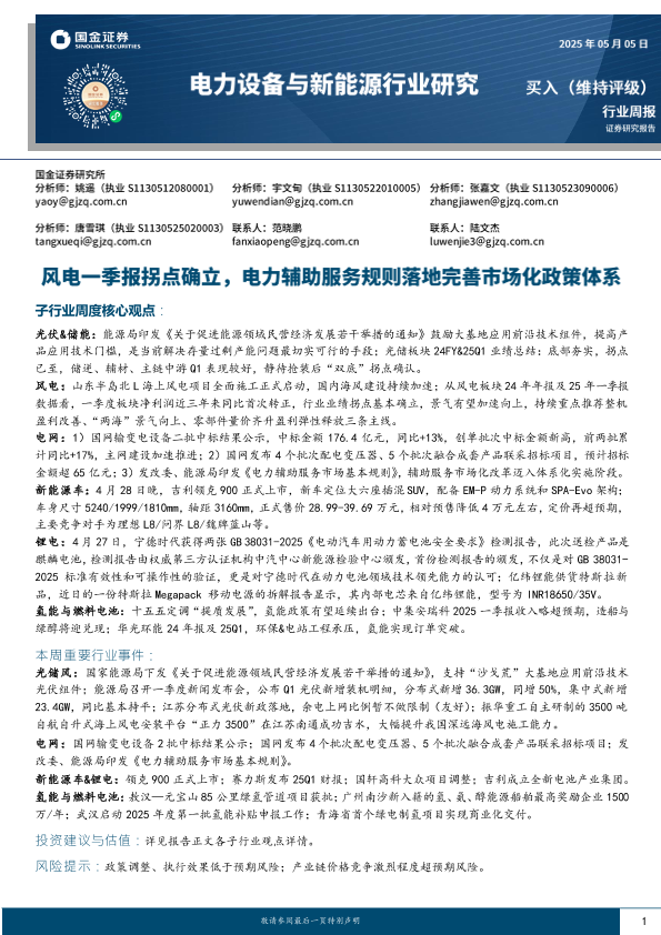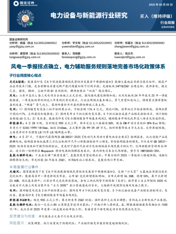 【国金证券】【202505】电力设备与新能源行业研究:风电一季报拐点确立,电力辅助服务规则落地完善市场化政策体系-17页