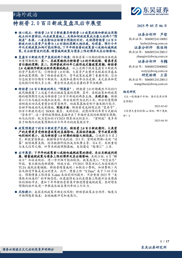 【东吴证券】【20250506】海外政治:特朗普2.0百日新政复盘及后市展望-17页
