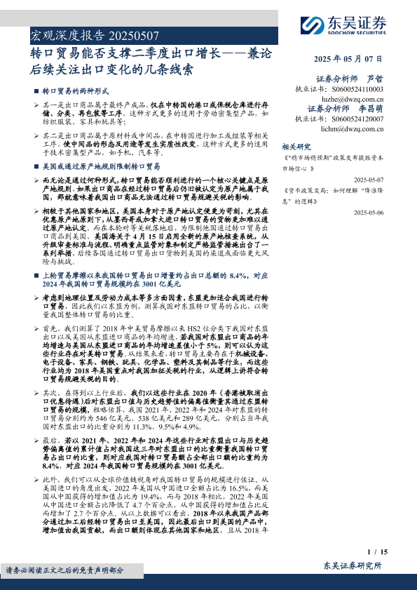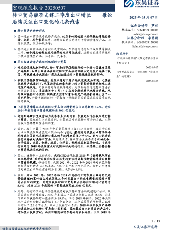 【东吴证券】【20250507】宏观深度报告:兼论后续关注出口变化的几条线索,转口贸易能否支撑二季度出口增长-15页