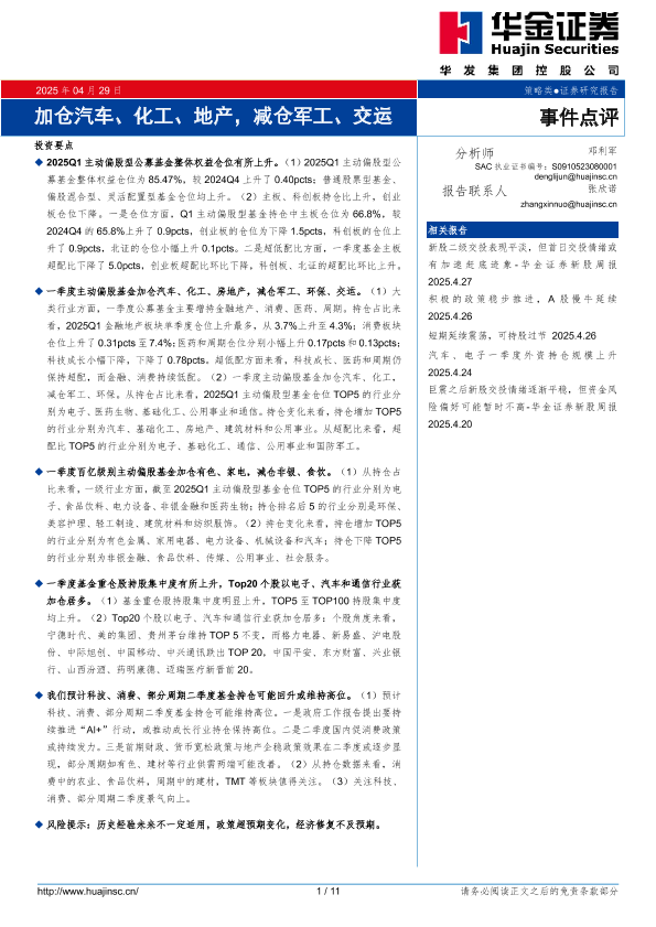 【华金证券】【20250429】加仓汽车、化工、地产,减仓军工、交运-11页