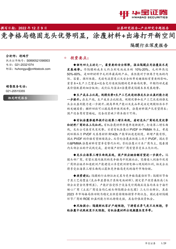 【华宝证券】【20221209】隔膜行业深度报告:竞争格局稳固龙头优势明显,涂覆材料+出海打开新空间-29页