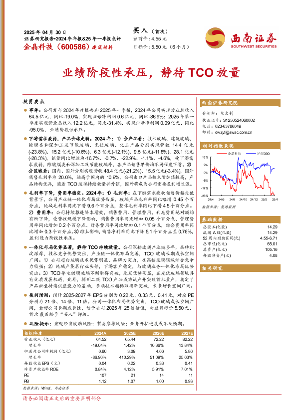 【西南证券】【20250430】金晶科技(600586)2024年年报&25年一季报点评:业绩阶段承压,静待TCO放量-15页