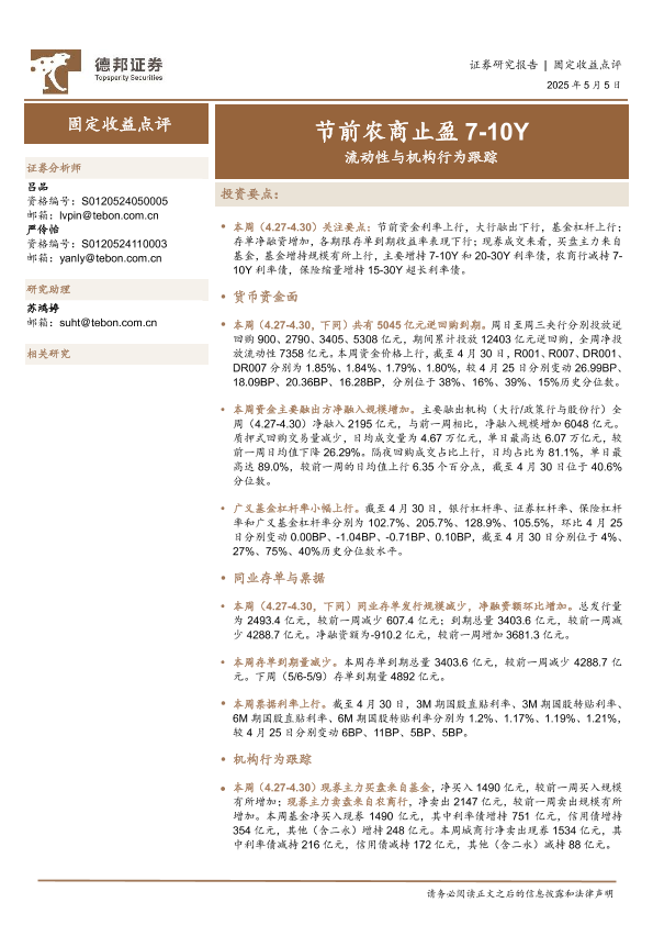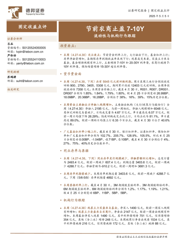 【德邦证券】【20250505】流动性与机构行为跟踪:节前农商止盈7-10Y-19页