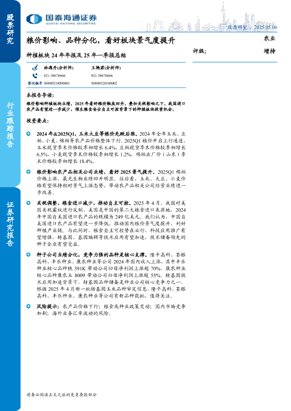 【国泰海通证券】【20250506】农业种植板块24年年报及25年一季报总结-10页
