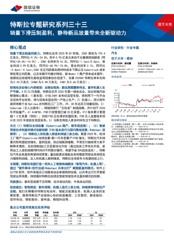 【国信证券】【20250504】汽车行业特斯拉专题研究系列三十三:销量下滑压制盈利,静待新品放量带来全新驱动力-16页