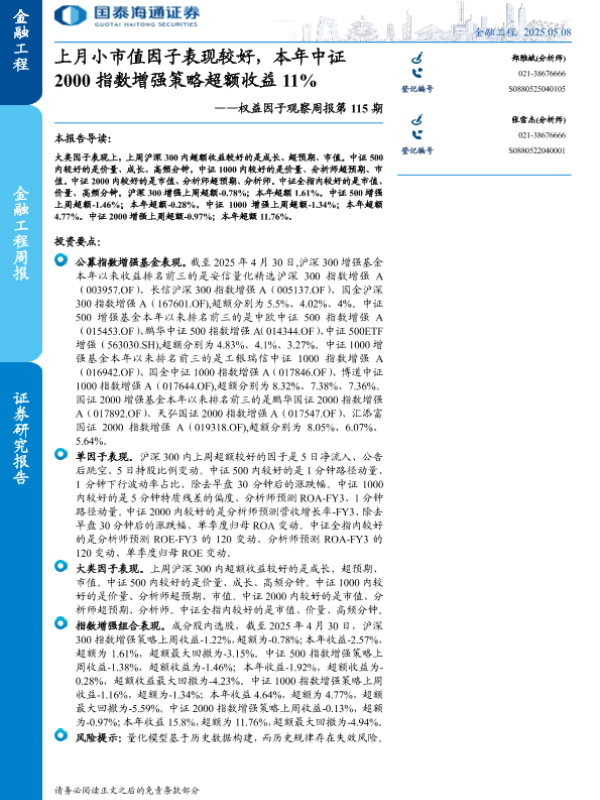 因子表现 指数增强 量化分析 金融工程 风险管理