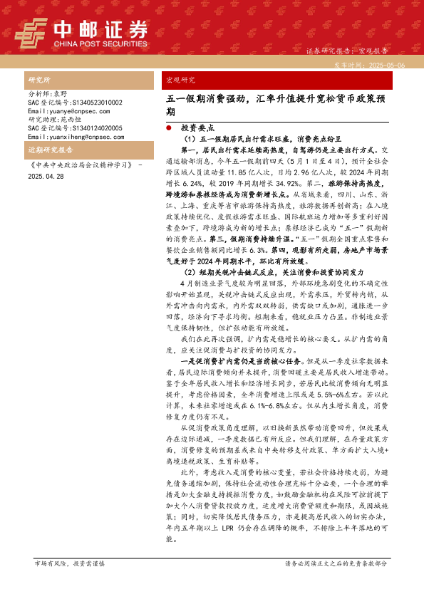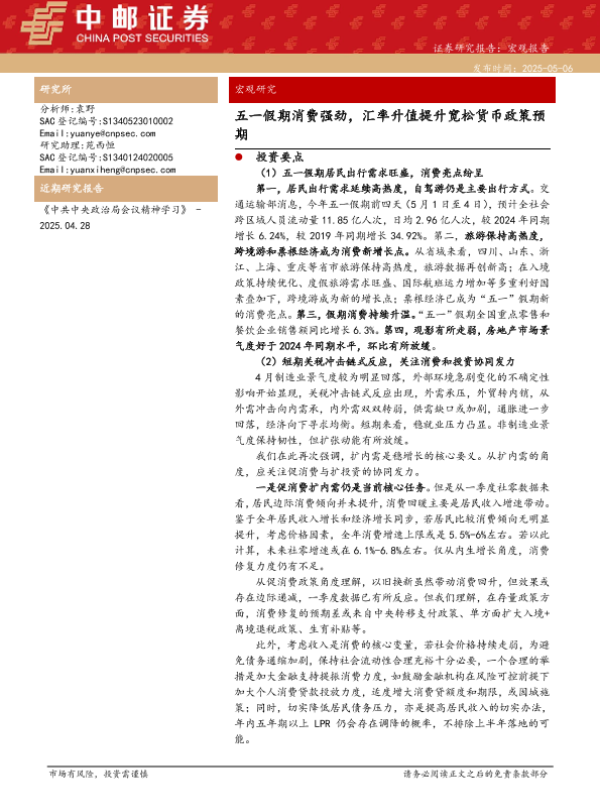 【中邮证券】【20250506】五一假期消费强劲,汇率升值提升宽松货币政策预期-49页