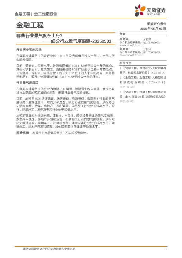 【天风证券】【20250503】细分行业景气度跟踪:哪些行业景气度在上行?-11页
