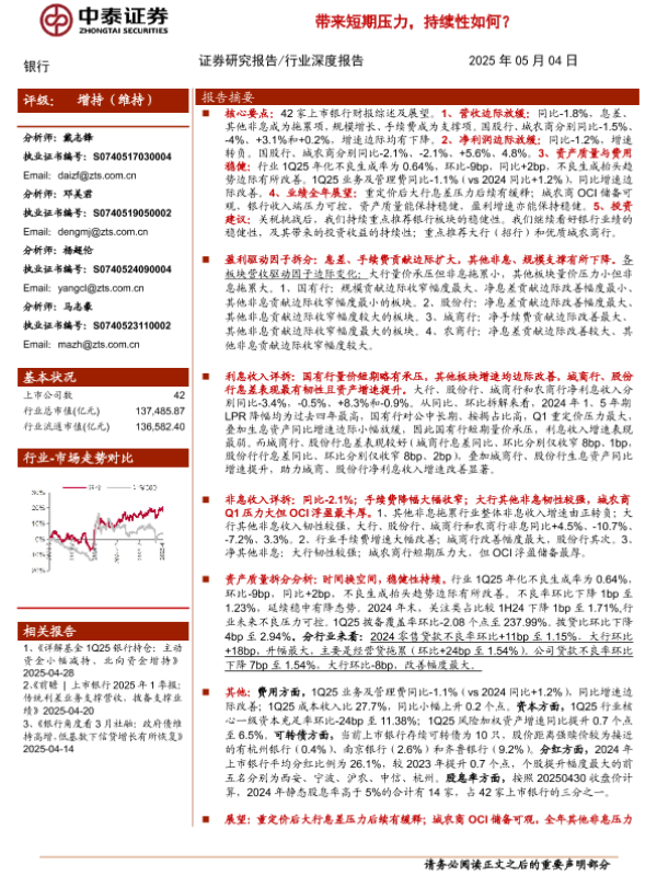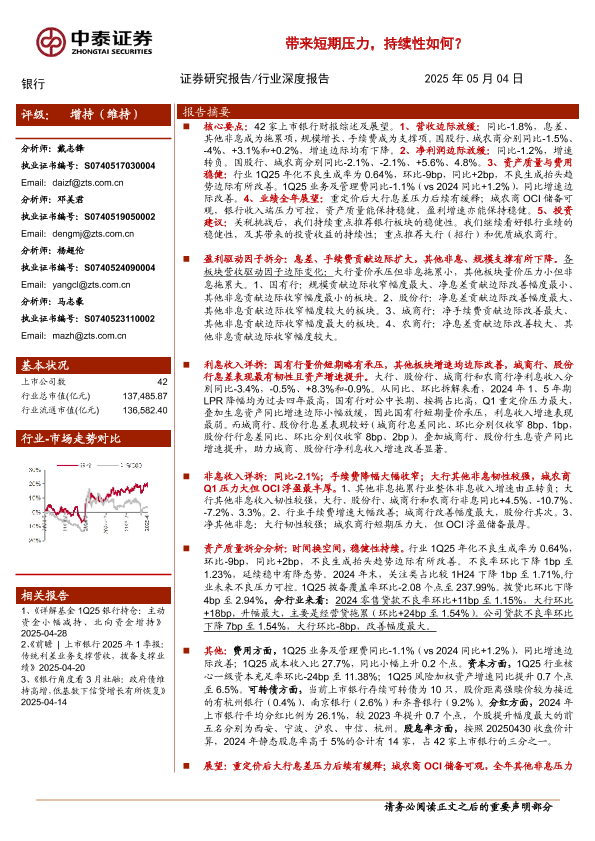 【中泰证券】【20250504】银行业深度综述与拆分|42家上市银行2024&1Q25财报:重定价与债市带来短期压力,持续性如何?-51页