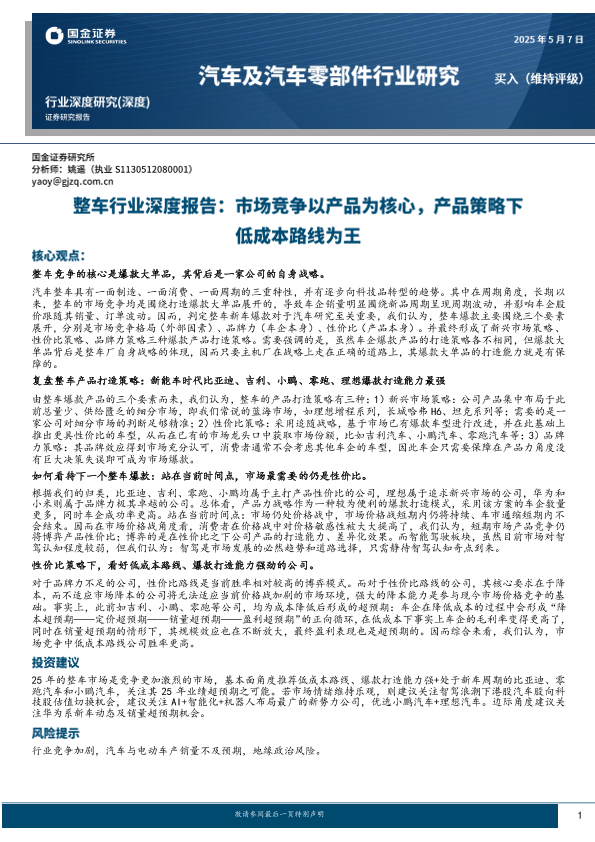 【国金证券】【20250507】整车行业深度报告:市场竞争以产品为核心,产品策略下低成本路线为王-48页