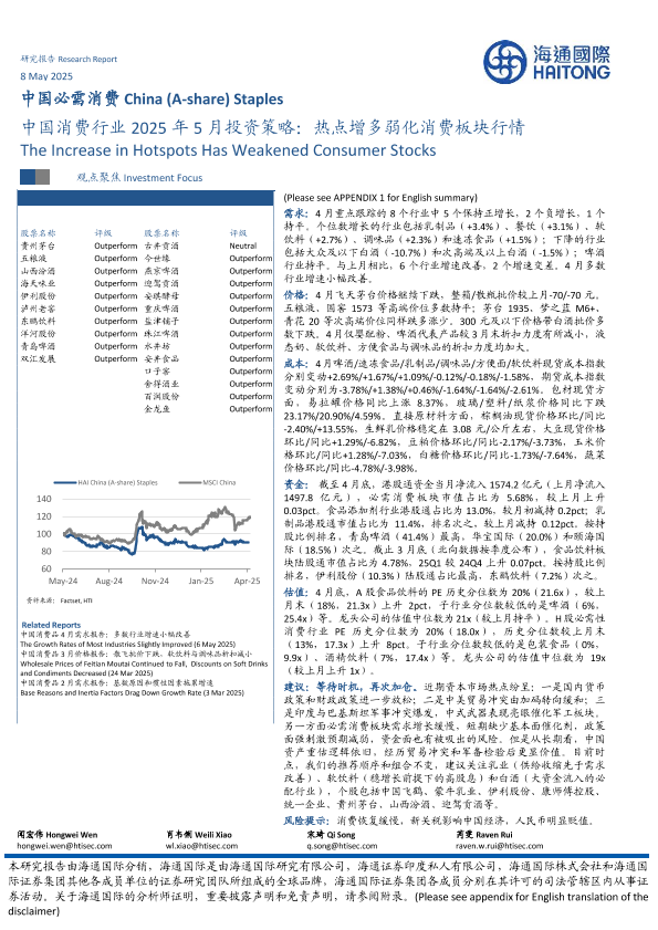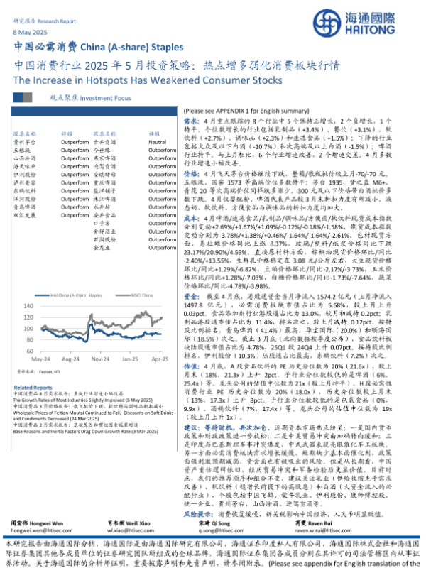 【海通国际】【20250508】中国消费行业2025年5月投资策略:热点增多弱化消费板块行情-42页
