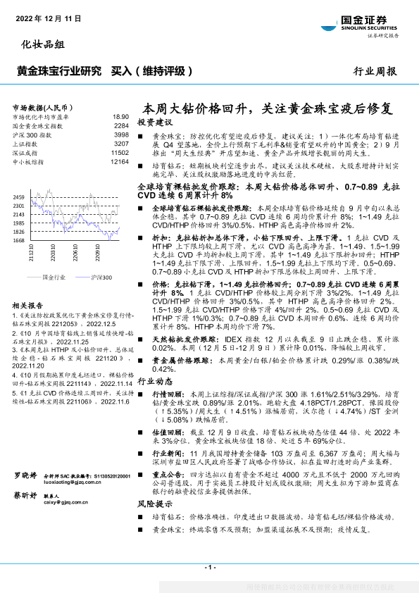 【国金证券】【20221211】黄金珠宝行业周报:本周大钻价格回升,关注黄金珠宝疫后修复-17页