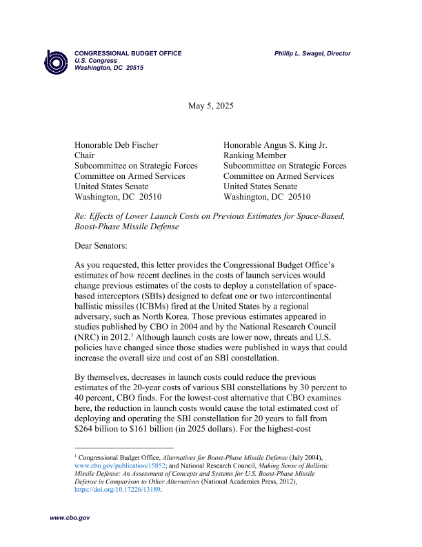 【Congressional Budget Office】【20250505】Effects of Lower Launch Costs on Previous Estimates for Space-Based, Boost-Phase Missile Defense-7页