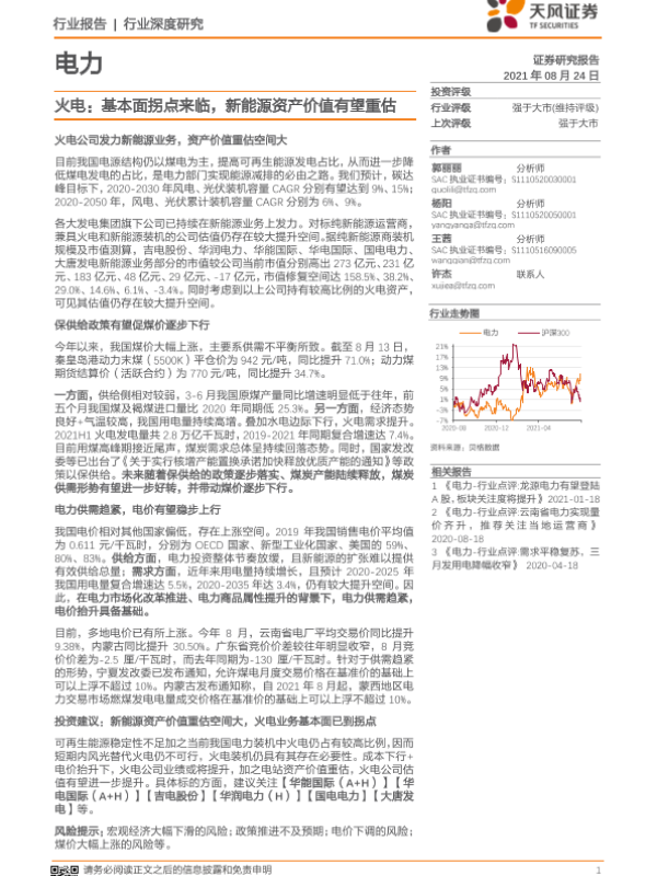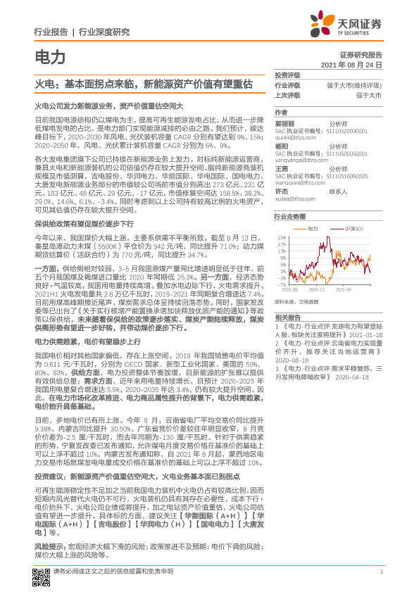 【天风证券】【20210824】电力行业:火电,基本面拐点来临,新能源资产价值有望重估-18页