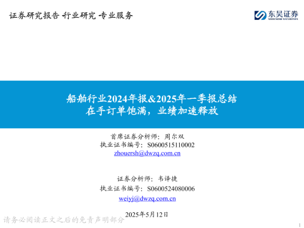 【东吴证券】【20250512】船舶行业2024年报&2025年一季报总结:在手订单饱满,业绩加速释放-36页