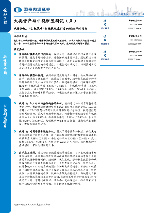 【国泰海通证券】【20250514】大类资产与中观配置研究(五):从涨停板、“打板策略”到赚钱效应引发的情绪择时指标-22页