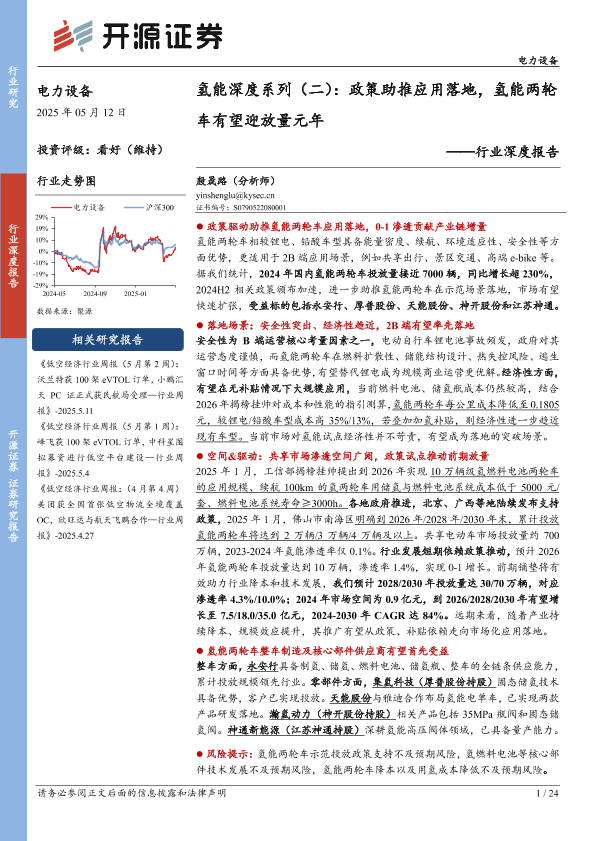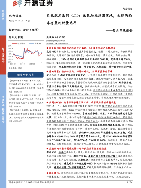 【开源证券】【20250512】电力设备行业氢能深度系列(二):政策助推应用落地,氢能两轮车有望迎放量元年-24页