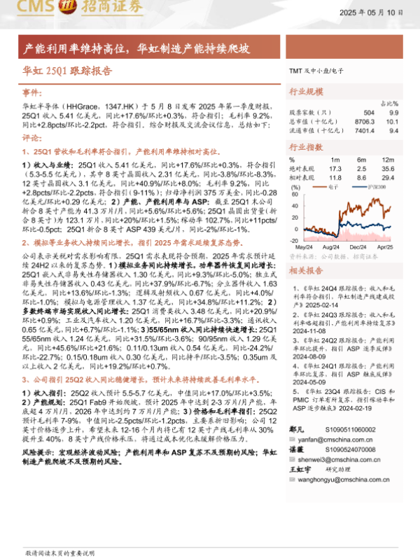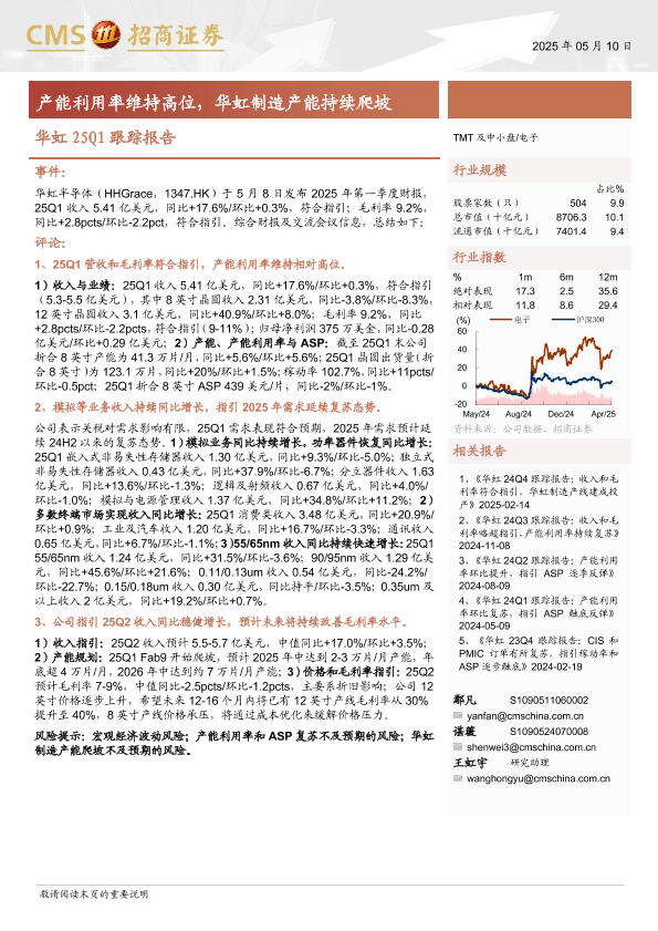 【海通证券】【20250510】电子行业华虹25Q1跟踪报告:产能利用率维持高位,华虹制造产能持续爬坡-12页