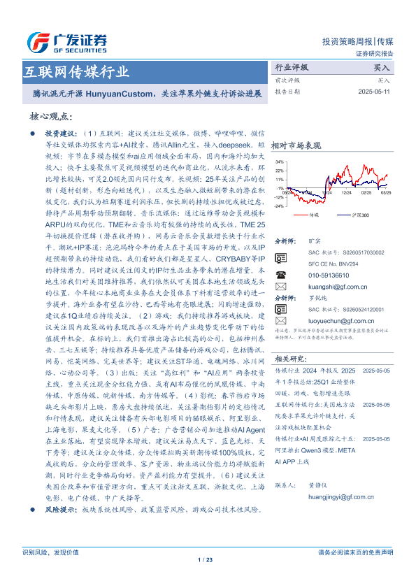 【广发证券】【20250511】互联网传媒行业:腾讯混元开源HunyuanCustom,关注苹果外链支付诉讼进展-23页