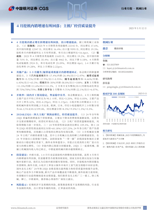 【银河证券】【20250512】机械行业行业月报:4月挖机内销增速有所回落;主机厂经营质量提升-23页