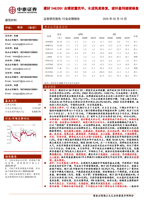 【中泰证券】【20250510】建材24&25Q1业绩披露完毕,水泥筑底修复,玻纤盈利继续修复-19页