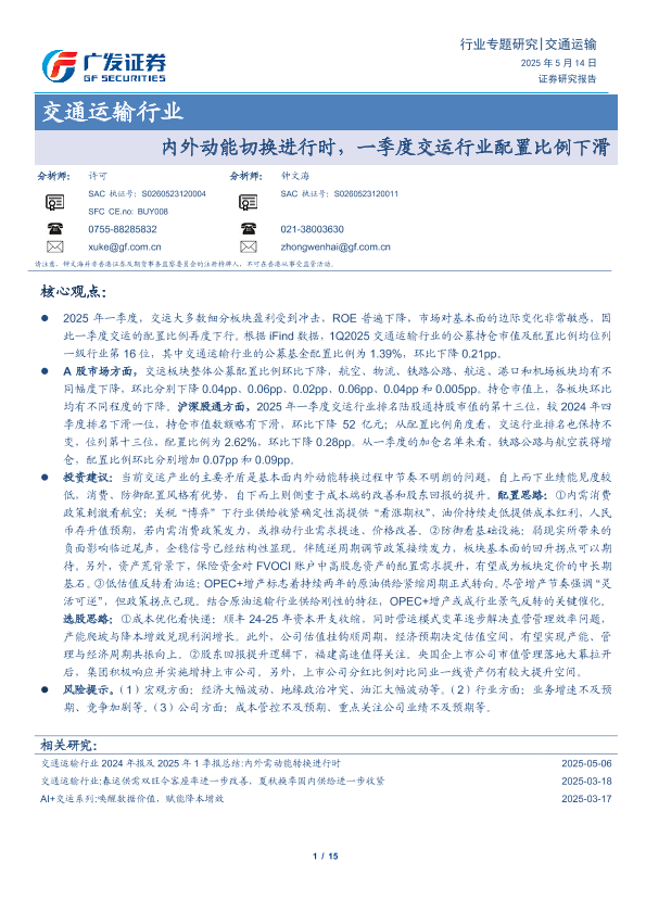 【广发证券】【20250514】交通运输行业:内外动能切换进行时,一季度交运行业配置比例下滑-15页