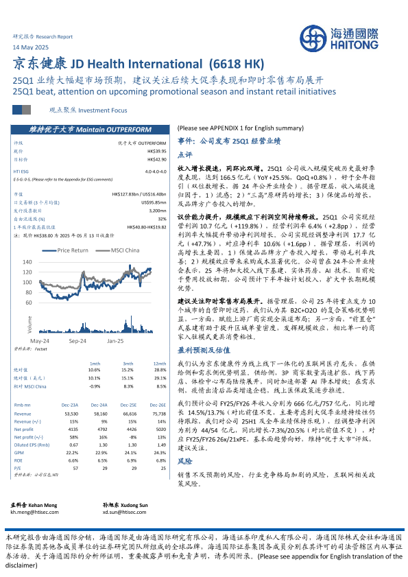 【海通国际】【20250514】京东健康25Q1业绩大幅超市场预期,建议关注后续大促季表现和即时零售布局展开-13页