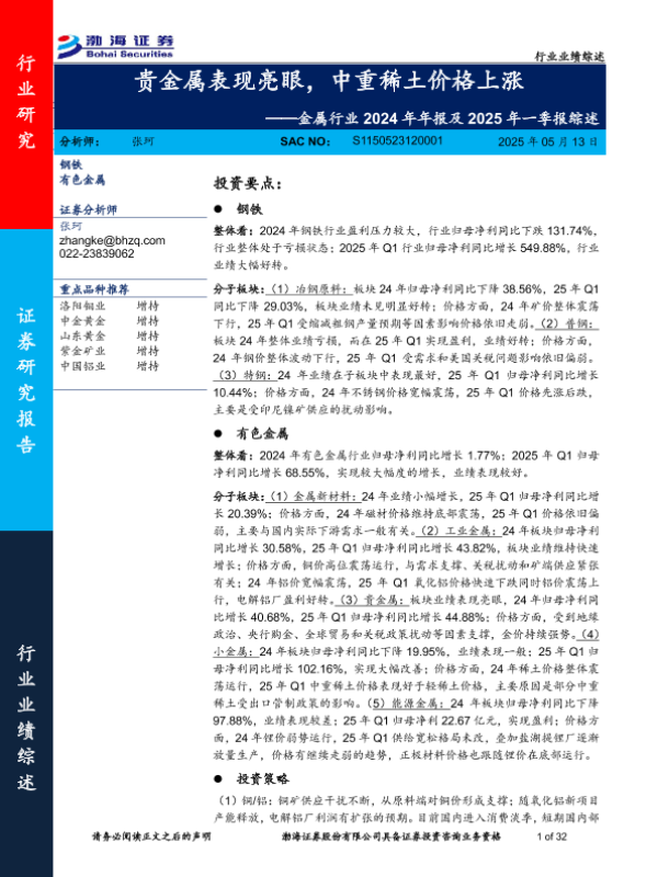 【渤海证券】【20250513】金属行业2024年年报及2025年一季报综述-32页