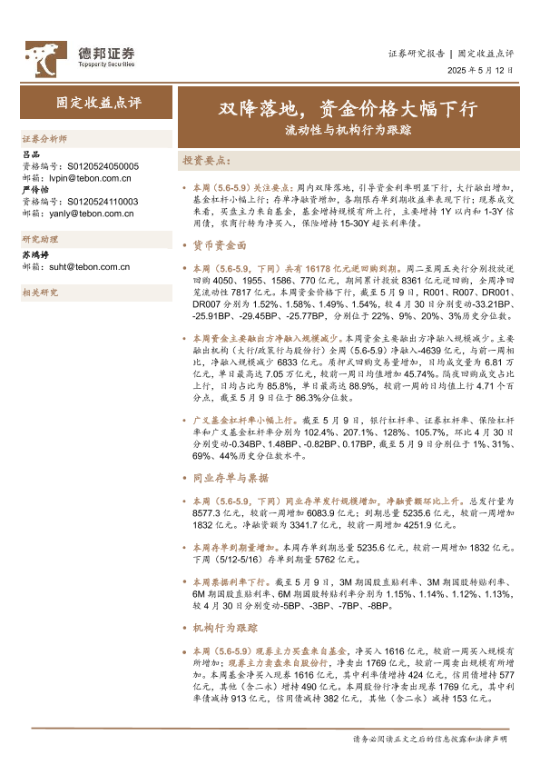 【德邦证券】【20250512】流动性与机构行为跟踪:双降落地,资金价格大幅下行-19页