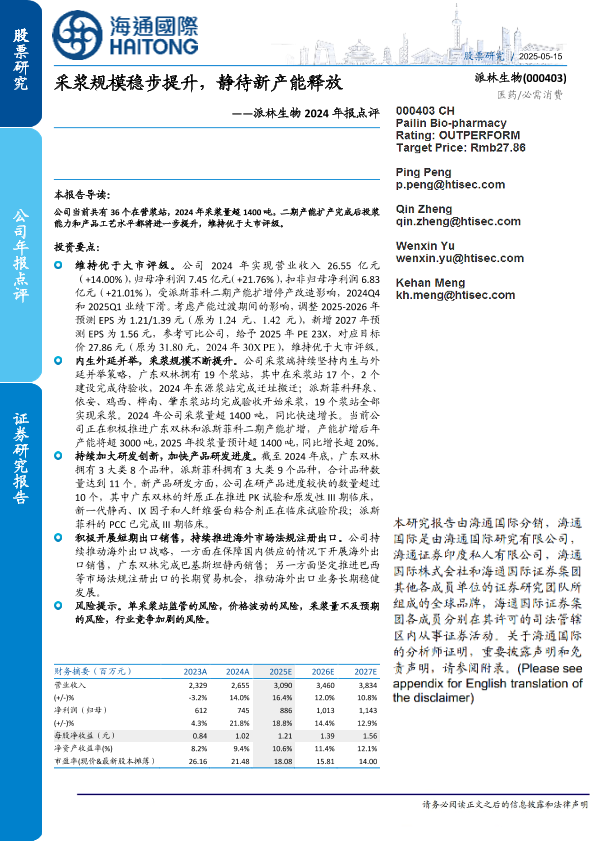 【海通国际】【20250504】派林生物2024年报点评:采浆规模稳步提升,静待新产能释放-12页