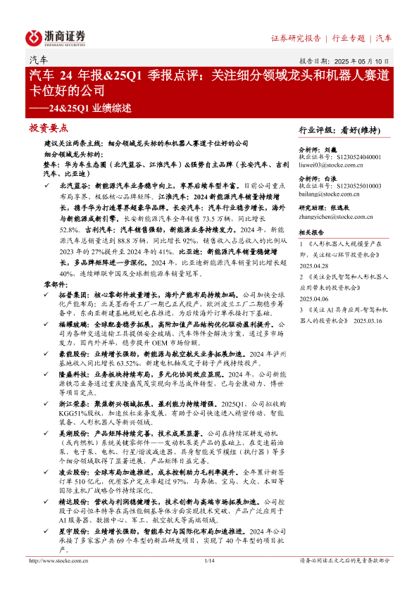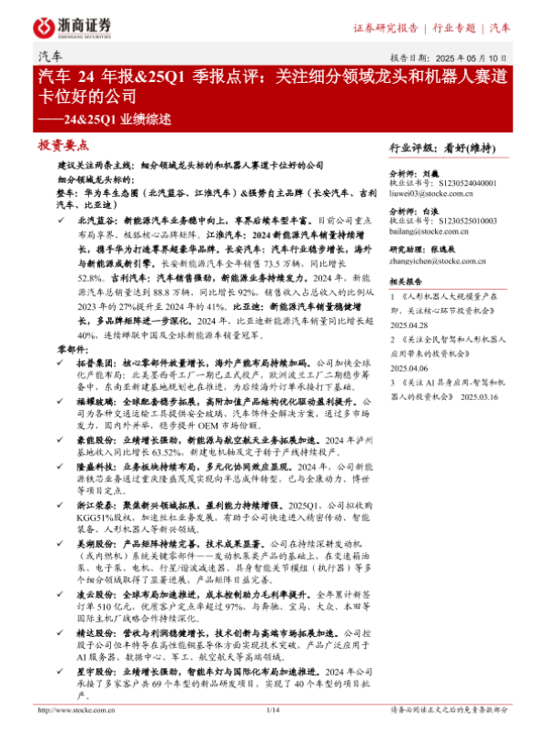 【浙商证券】【20250510】汽车24年报&25Q1季报点评:关注细分领域龙头和机器人赛道卡位好的公司-14页