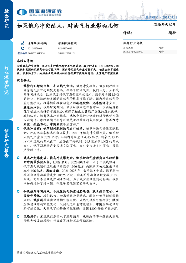 【国泰海通证券】【20250511】如果俄乌冲突结束,对油气行业影响几何-23页