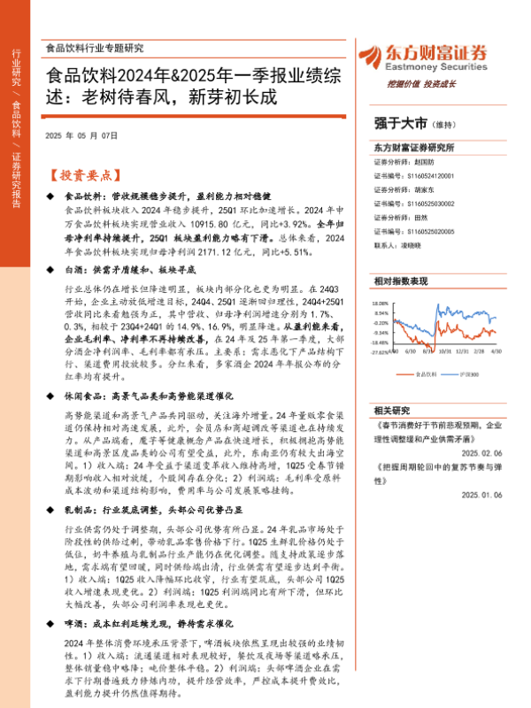 【东方财富证券】【20250507】食品饮料行业2024年&2025年一季报业绩综述:老树待春风,新芽初长成-31页