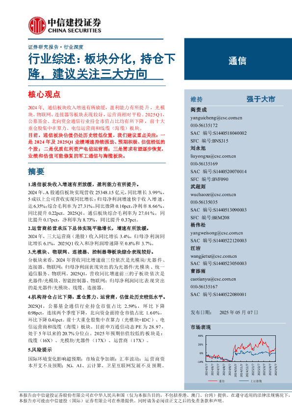【中信建投证券】【20250507】通信行业综述:板块分化,持仓下降,建议关注三大方向-23页