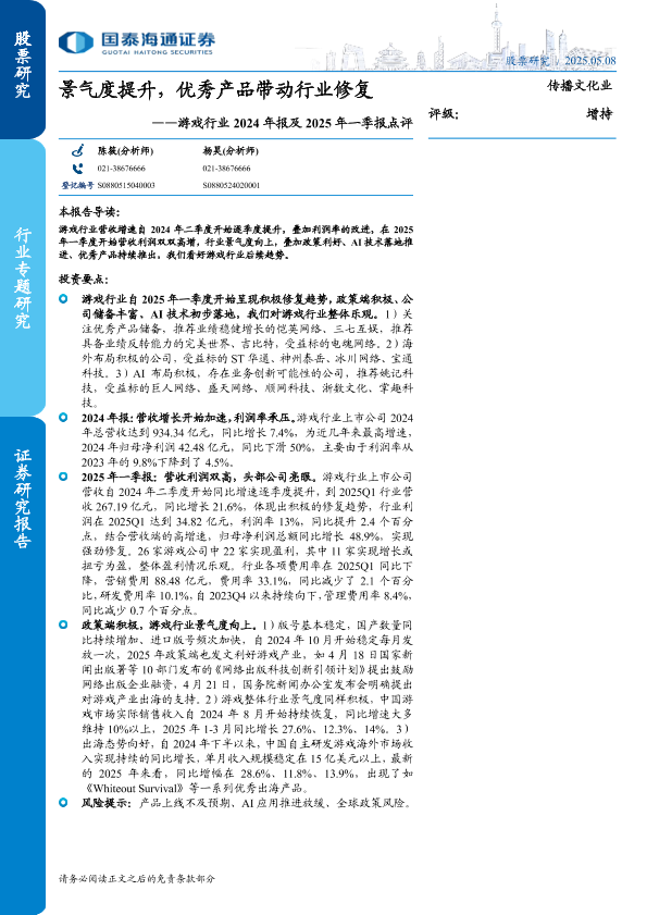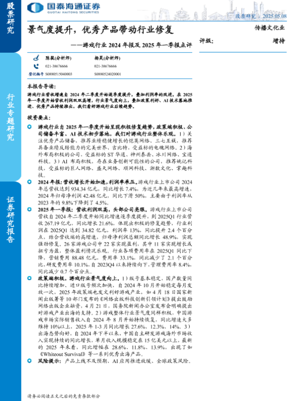 【国泰海通证券】【20250508】游戏行业2024年报及2025年一季报点评-15页