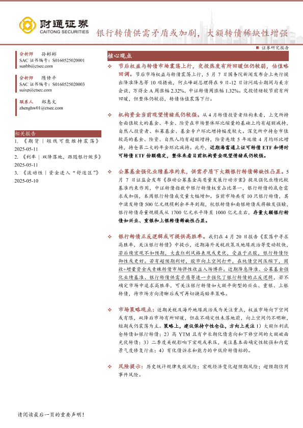 【财通证券】【20250511】银行转债供需矛盾或加剧,大额转债稀缺性增强-14页