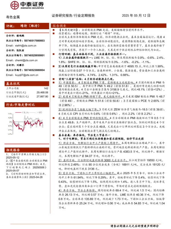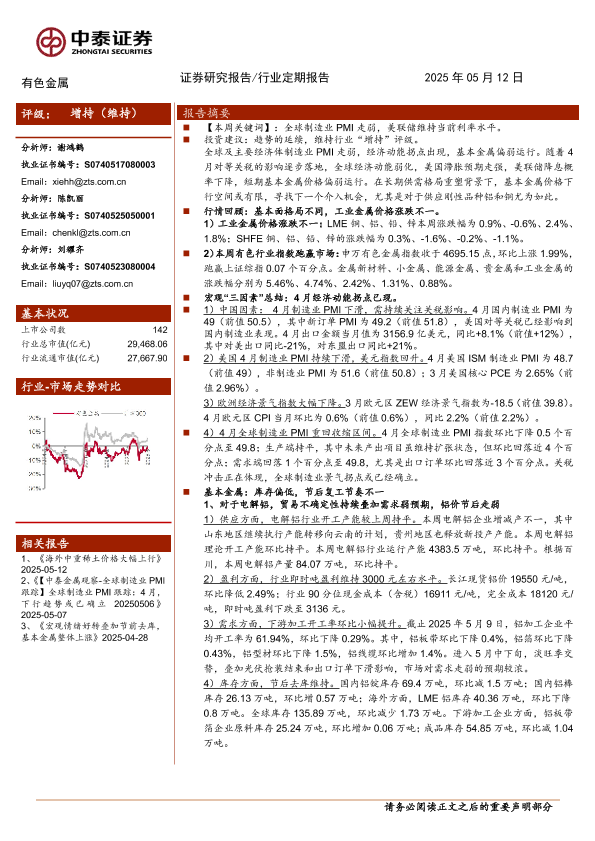 【中泰证券】【20250512】有色金属行业:全球制造业PMI走弱,基本金属偏弱运行-24页