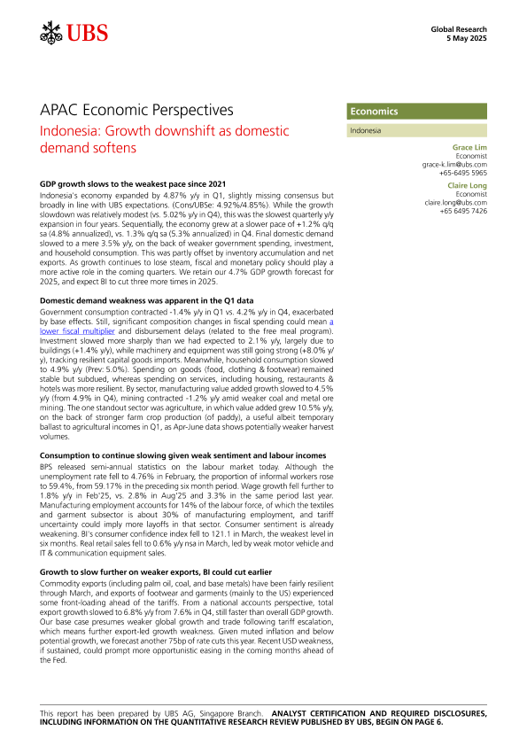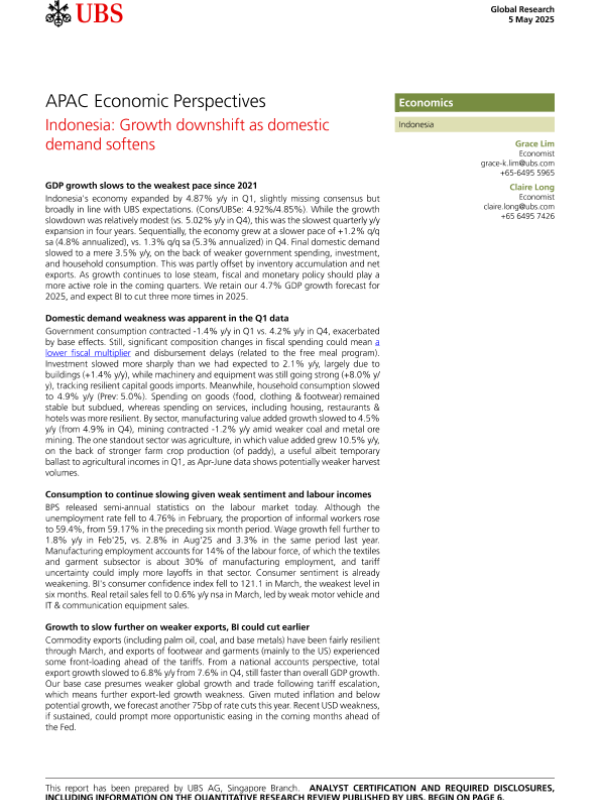 【UBS AG】【20250505】APAC Economic Perspectives Indonesia Growth downshift as domestic demand softens-9页