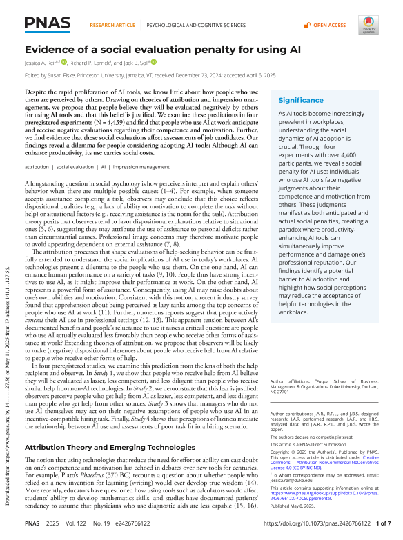 【Jessica A. Reif】【20250508】Evidence of a social evaluation penalty for using AI-7页