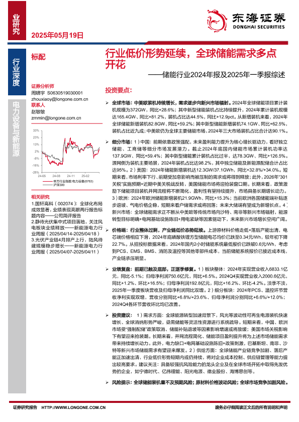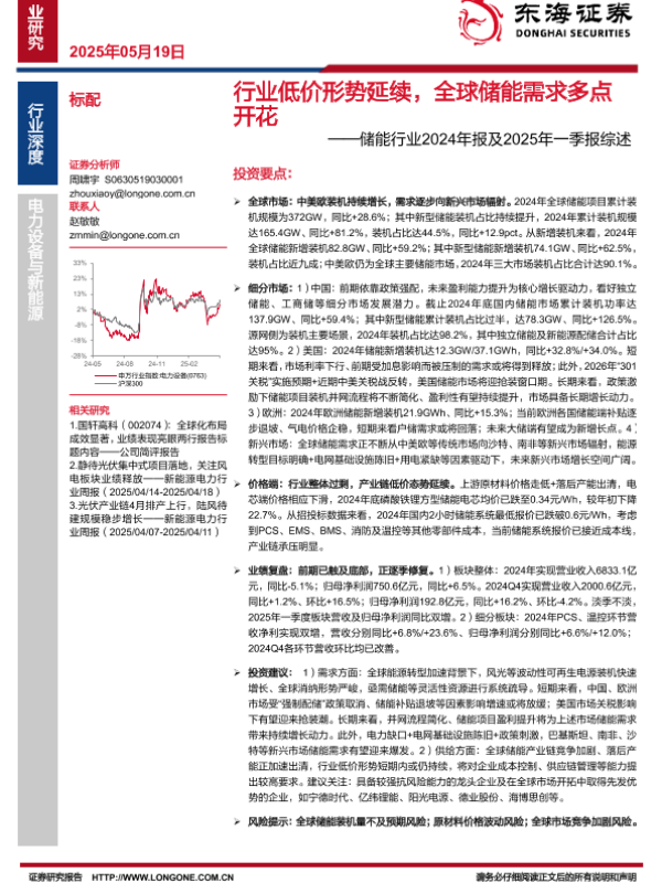 【东海证券】【20250519】储能行业2024年报及2025年一季报综述:行业低价形势延续,全球储能需求多点开花-19页