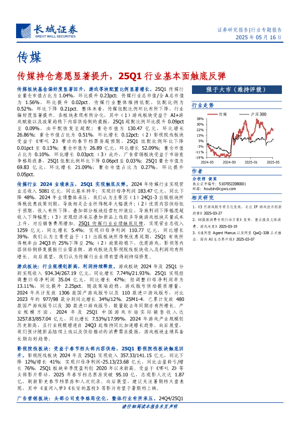 【长城证券】【20250516】传媒行业:传媒持仓意愿显著提升,25Q1行业基本面触底反弹-34页