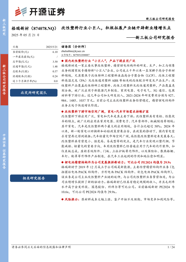 【开源证券】【20250521】格瑞新材(874078)新三板公司研究报告:改性塑料行业小巨人,积极拓展产业链开辟新业绩增长点-24页