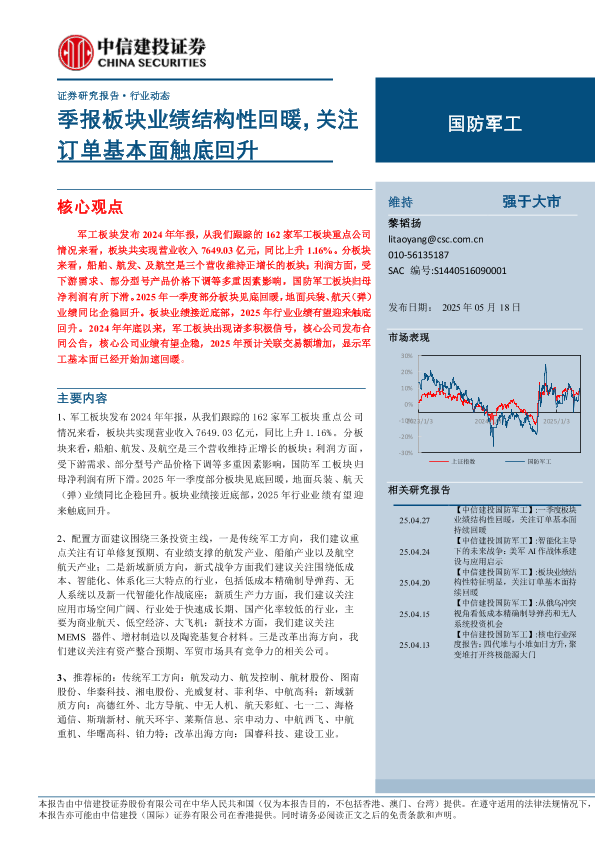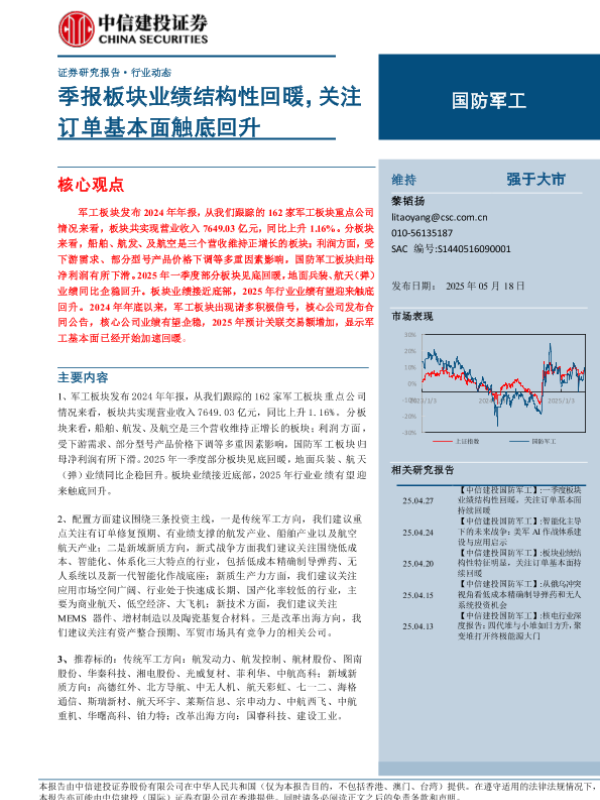 【中信建投证券】【20250518】国防军工行业动态:季报板块业绩结构性回暖,关注订单基本面触底回升-31页