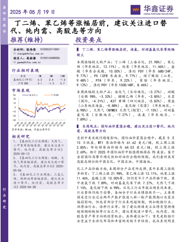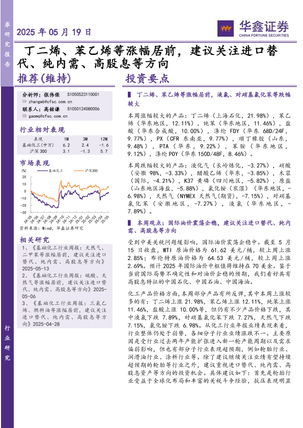 【华鑫证券】【20250519】化工行业研究:丁二烯、苯乙烯等涨幅居前,建议关注进口替代、纯内需、高股息等方向-31页