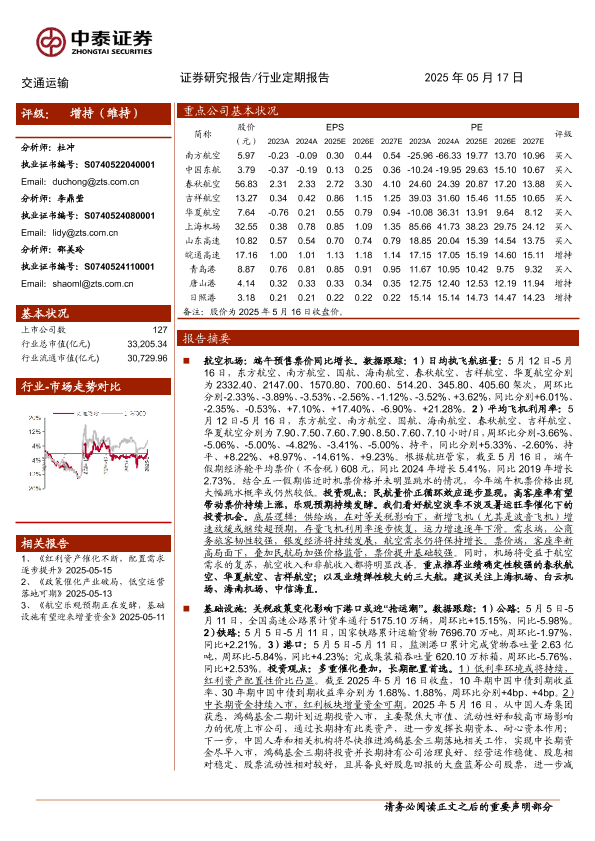 【中泰证券】【20250517】交通运输行业:航空量价向好可期,集运迎来多重催化-24页
