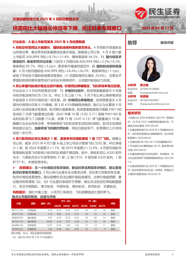 【民生证券】【20250517】交通运输物流行业2025年4月航空数据点评-13页