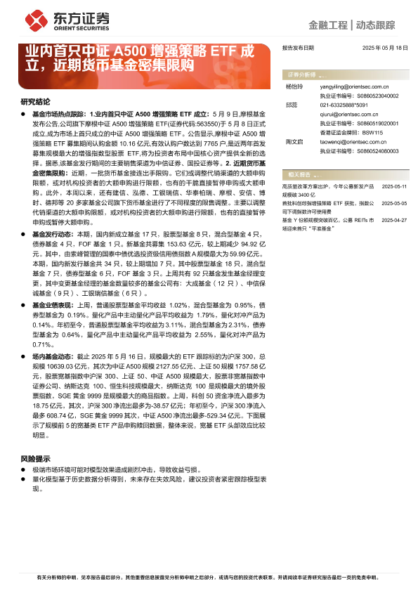 【东方证券】【20250518】金融工程动态跟踪:业内首只中证A500增强策略ETF成立,近期货币基金密集限购-13页