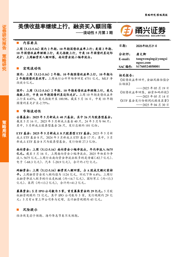 【甬兴证券】【20250521】流动性5月第2期:美债收益率继续上行,融资买入额回落-10页