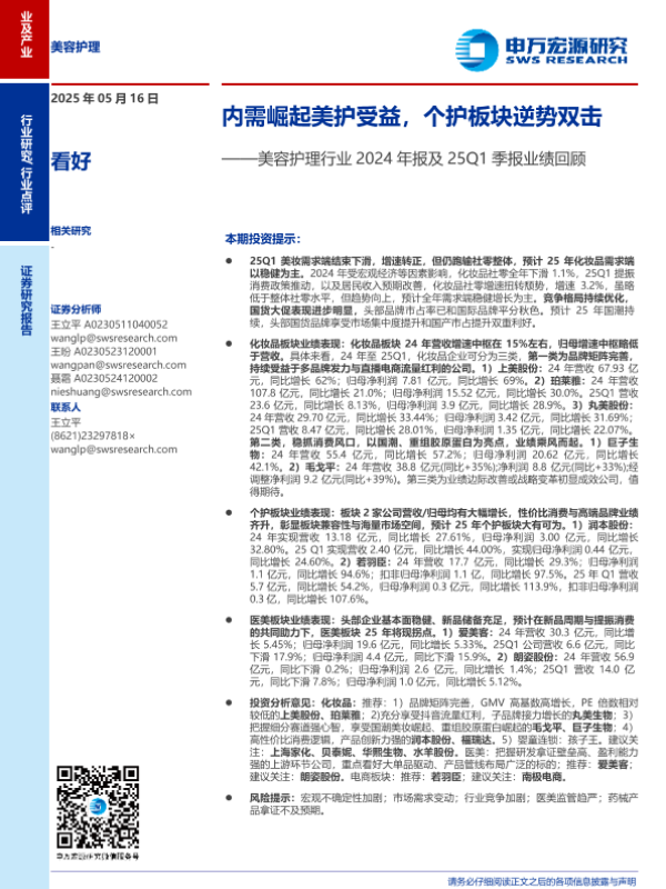 【申万宏源】【20250516】美容护理行业2024年报及25Q1季报业绩回顾-15页