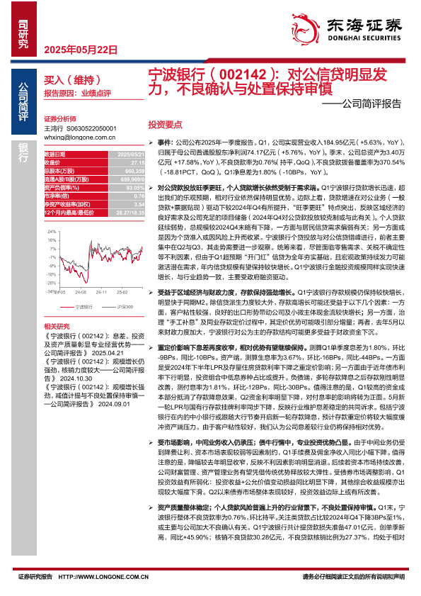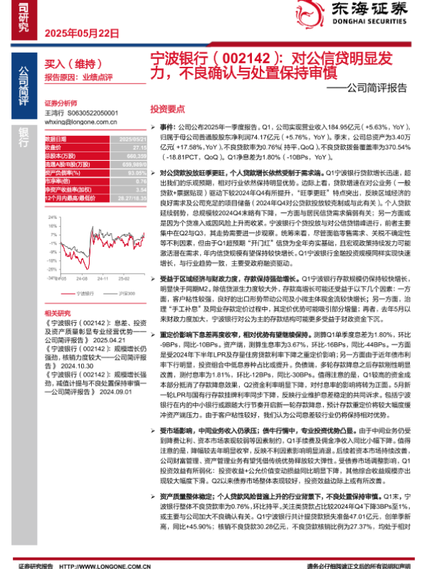 【东海证券】【20250522】宁波银行(002142):对公信贷明显发力,不良确认与处置保持审慎——公司简评报告-10页